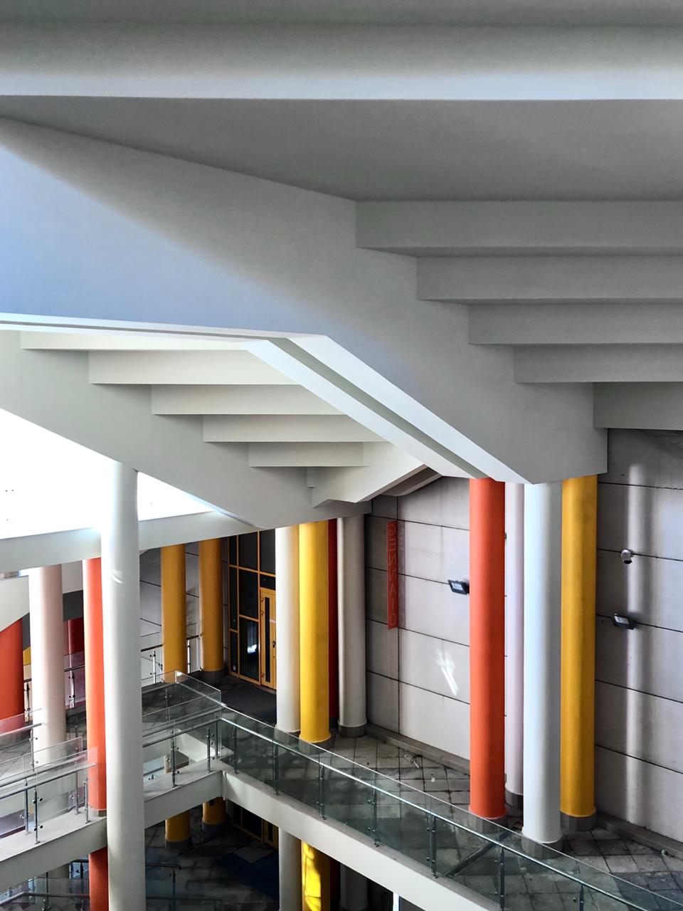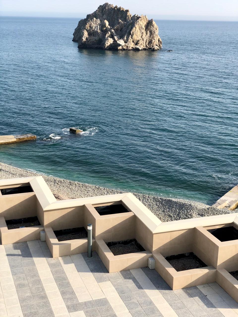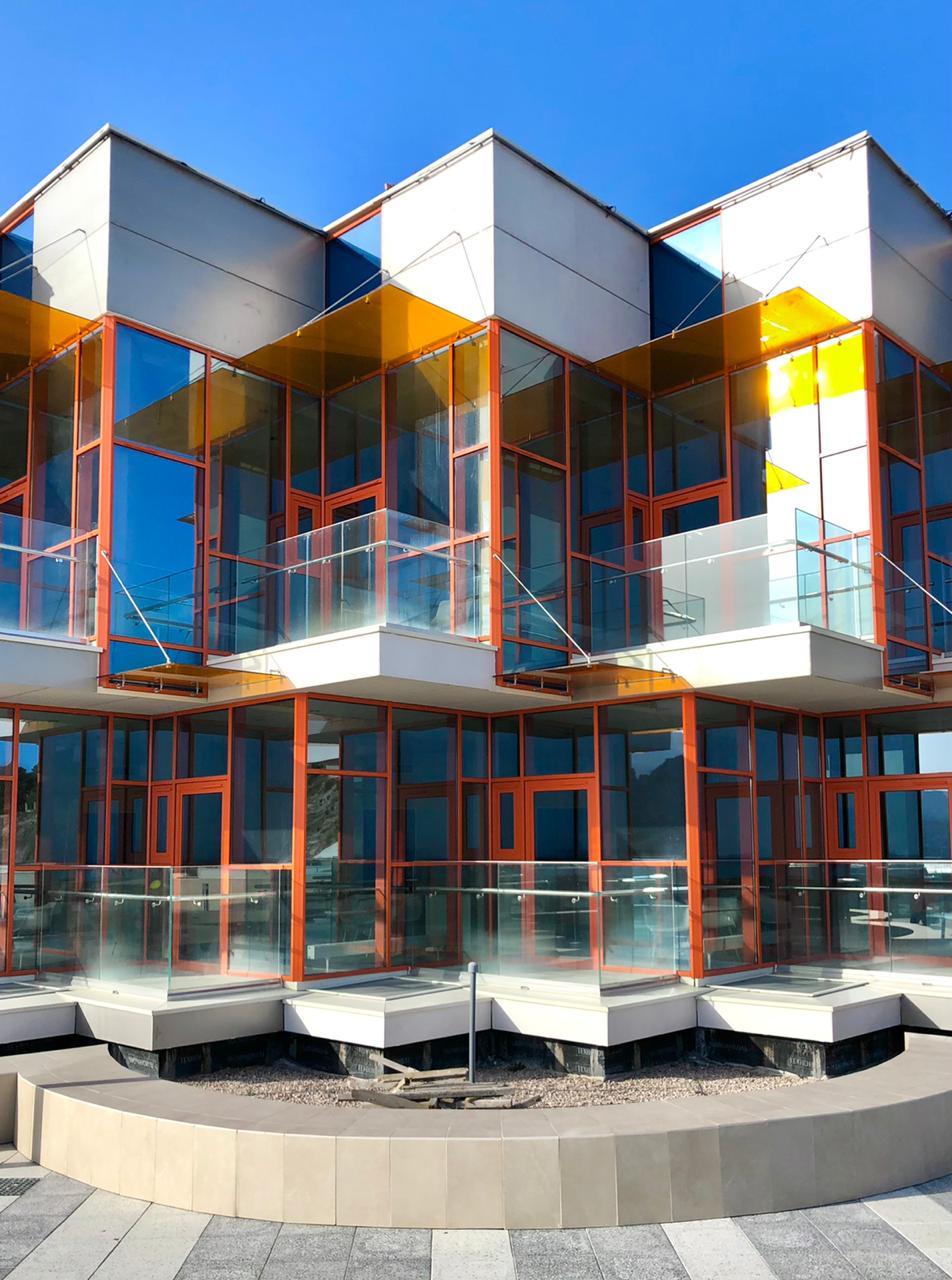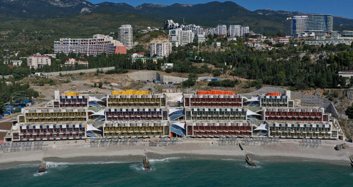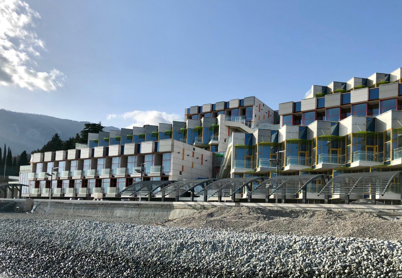 Вдоль остекленных главных фасадов, обращенных к морю, расположены ряды балконов прямоугольной и треугольной форм с солнцезащитными навесами.