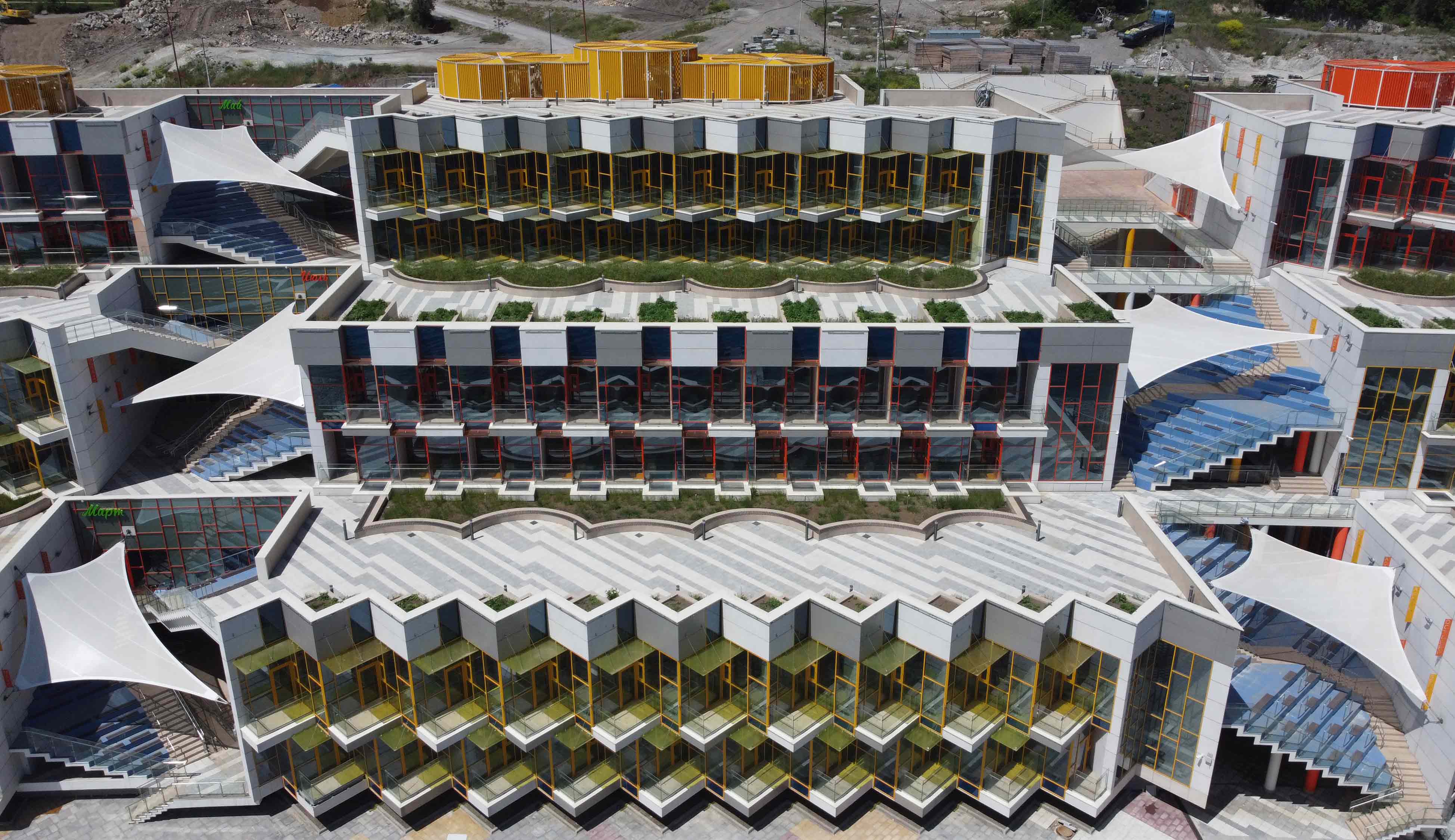 Вследствие расположения на сложном горном рельефе с большими разнонаправленными уклонами каждый блок представляет собой три двухэтажных объема, ступенчато расположенные друг над другом.