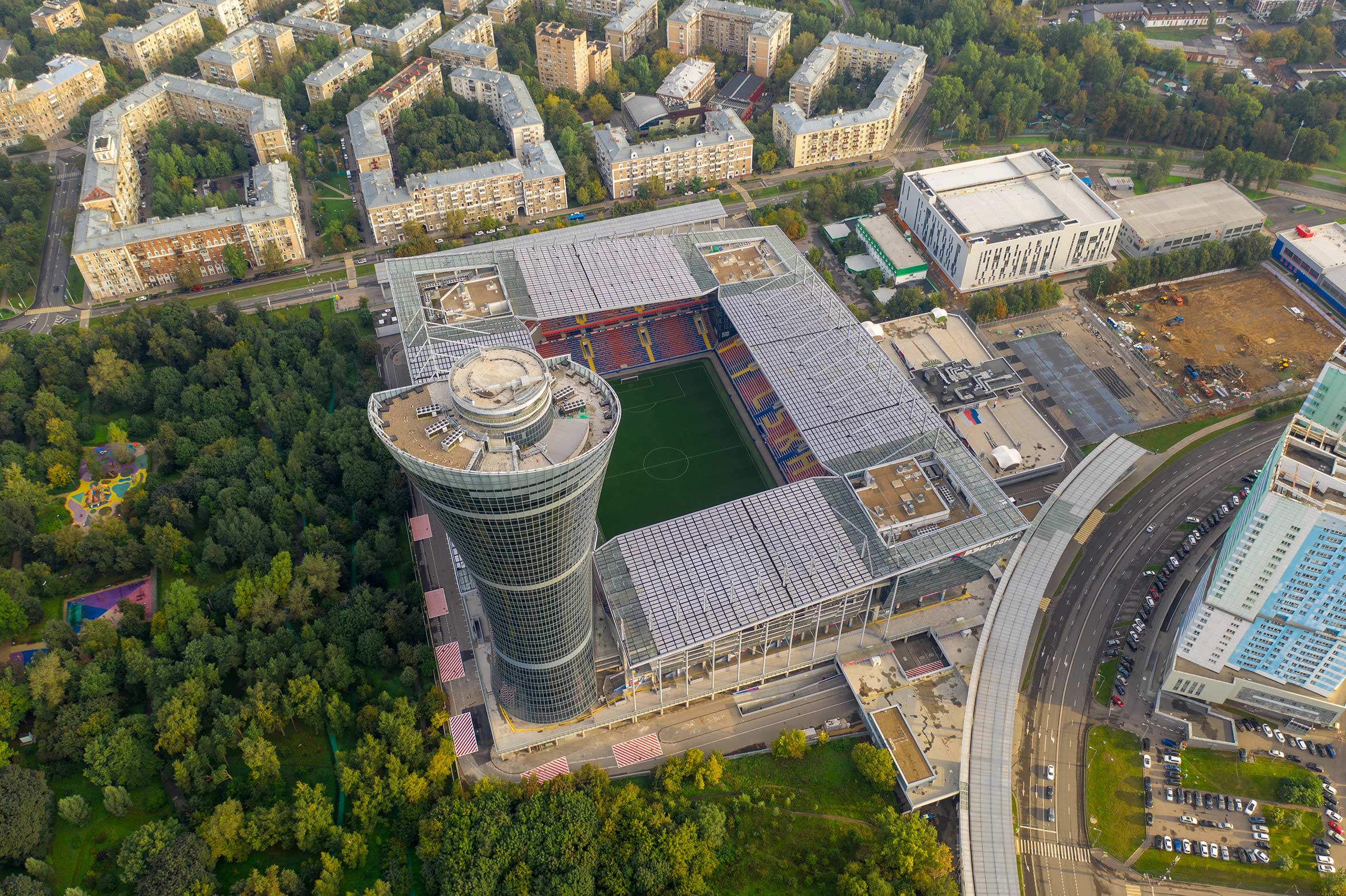 Стадион имеет четыре автономные трибуны, разделённые расположенными в углах стадиона четырьмя объемами офисных и гостиничных блоков, объединены единой плитой покрытия трибун, имеющей форму гиперболического параболоида. Один из угловых объемов поднимается выше покрытия до отметки 142 метра и служит как ориентиром для движущихся к стадиону зрителей, так и значимым элементом ансамбля Ходынского поля – башня стадиона замыкает перспективу бывшей взлётно-посадочной полосы, ставшей главной аллеей парка.