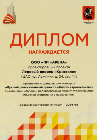 ЛЕДОВЫЙ ДВОРЕЦ «КРИСТАЛЛ» ПОЛУЧИЛ ДИПЛОМ ФИНАЛИСТА КОНКУРСА «ЛУЧШИЙ РЕАЛИЗОВАННЫЙ ПРОЕКТ В ОБЛАСТИ СТРОИТЕЛЬСТВА»