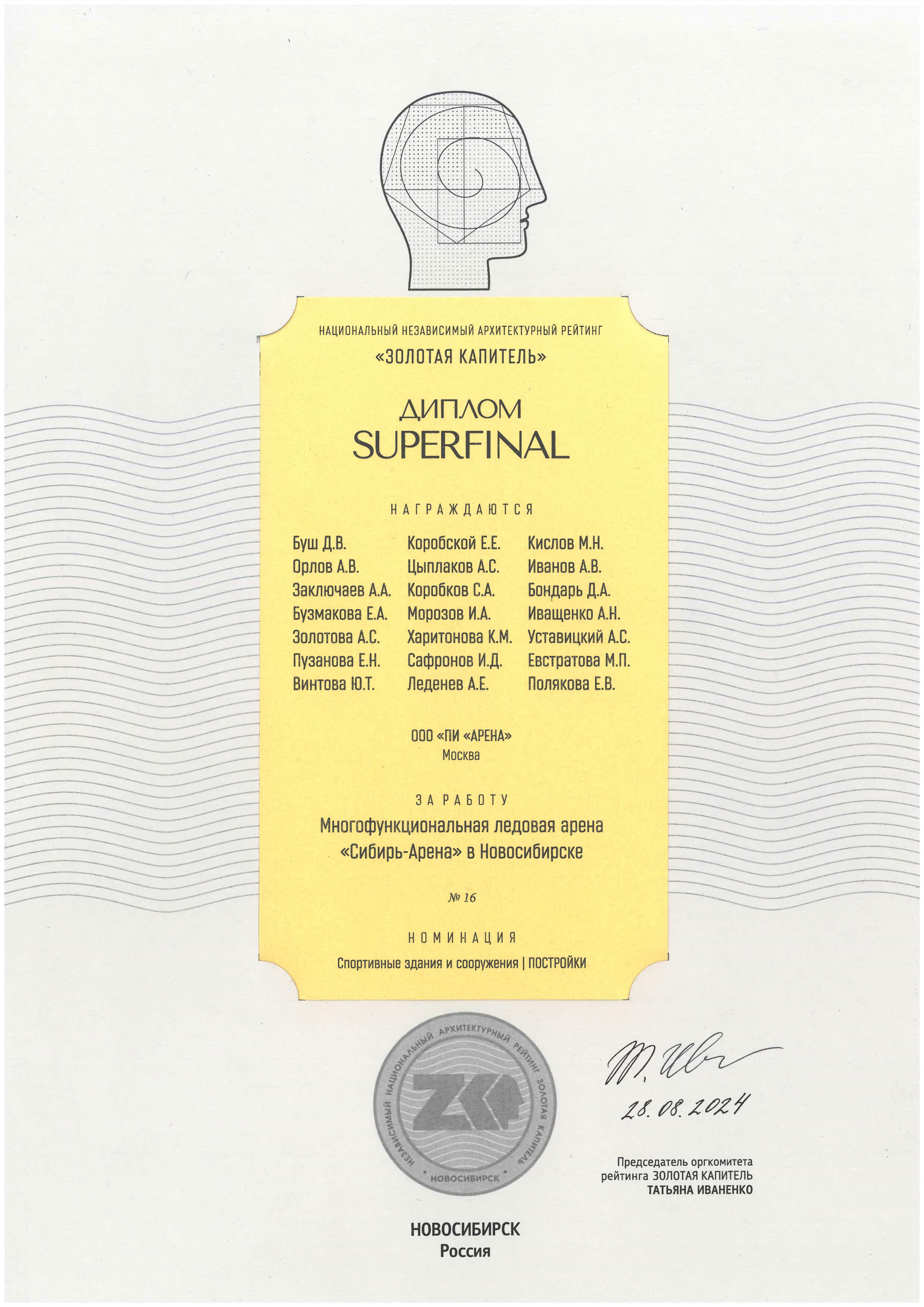 Дипломом «ЗОЛОТАЯ КАПИТЕЛЬ» награждён Ледовый дворец СИБИРЬ-АРЕНА