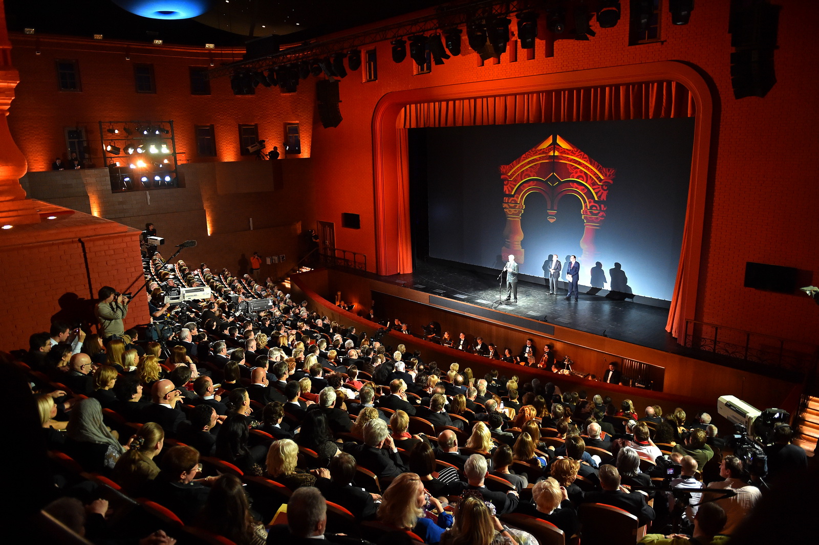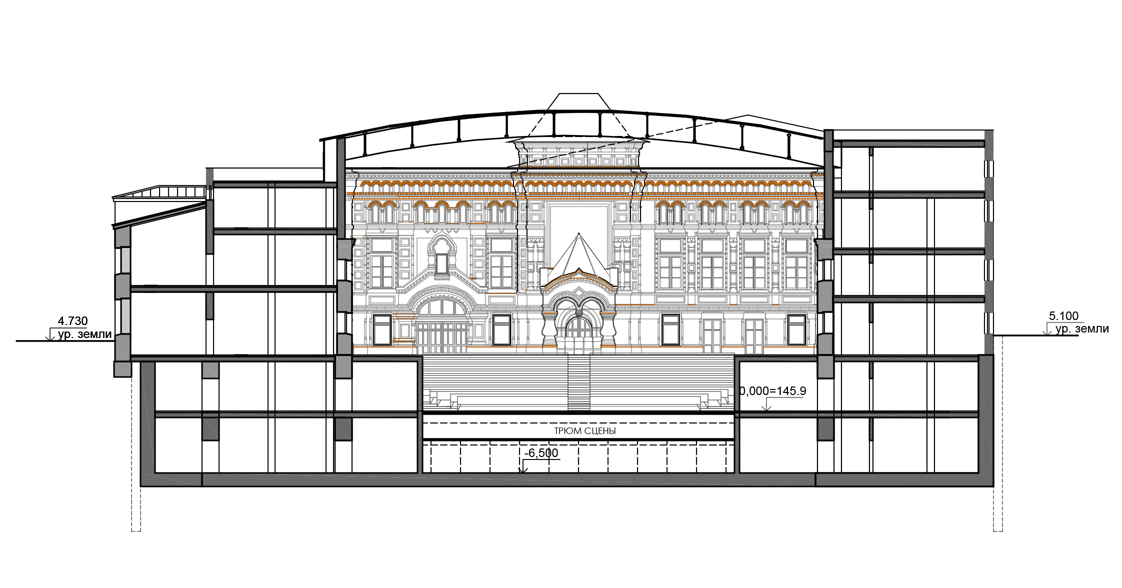 Торцевые фасады представляют собой мультимедийные экраны, на которых два ключевых произведения – Черный квадрат и Красный квадрат – чередуются с информацией о текущих мероприятиях.