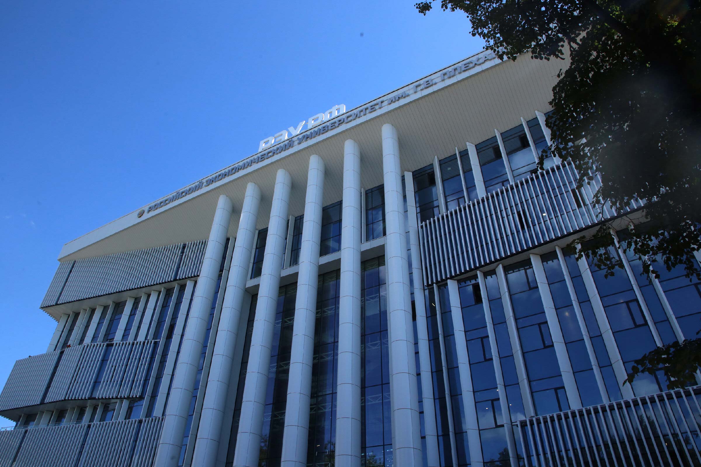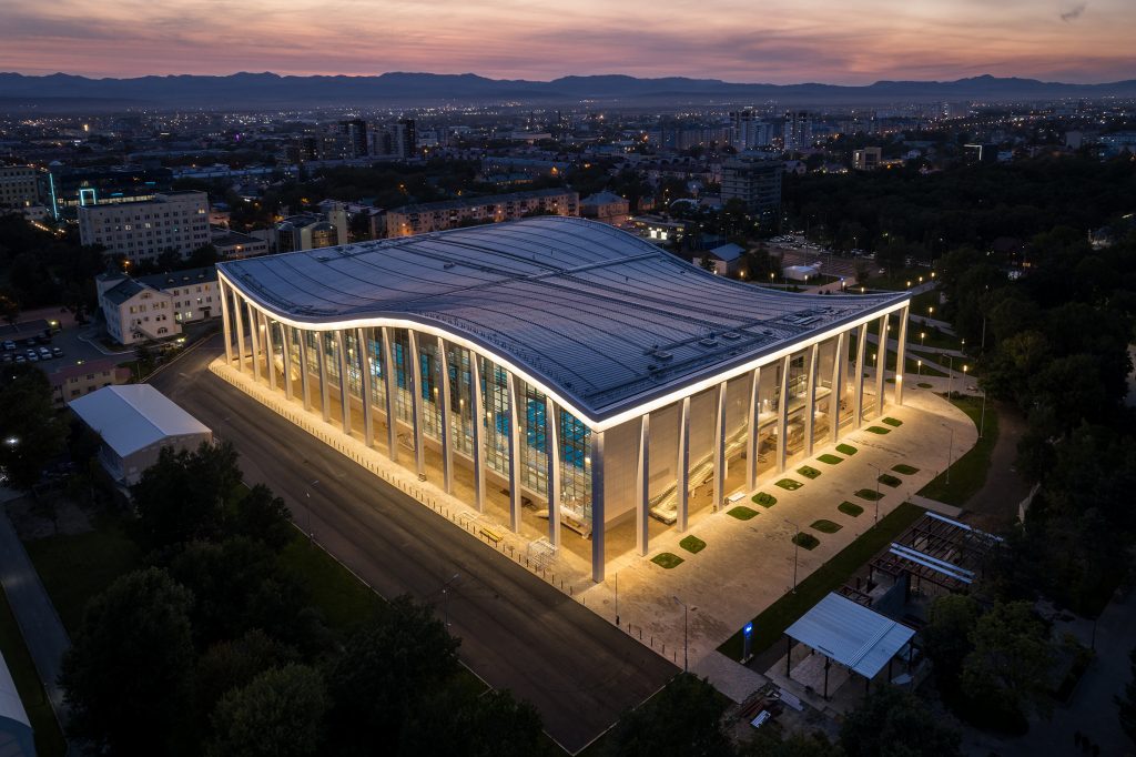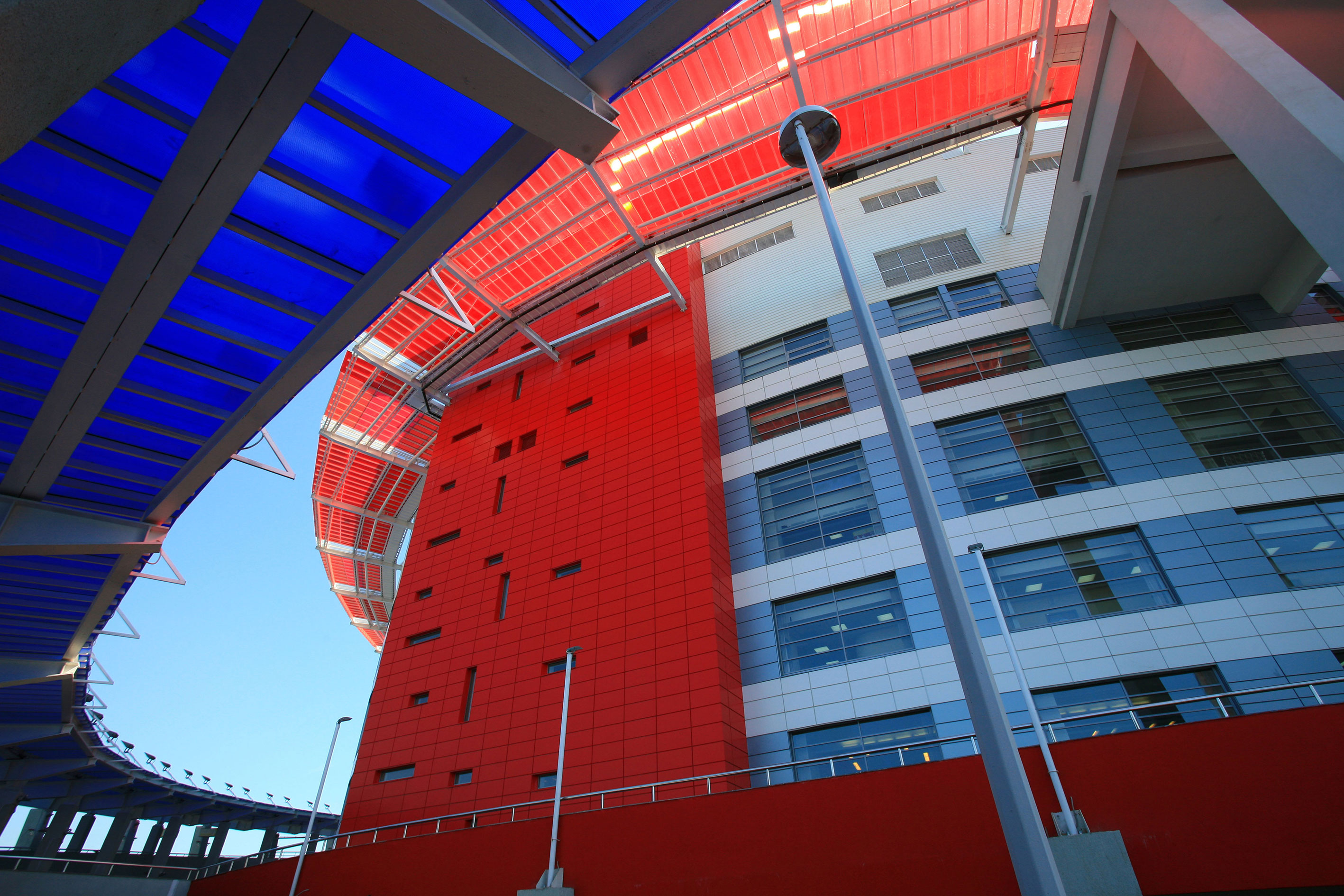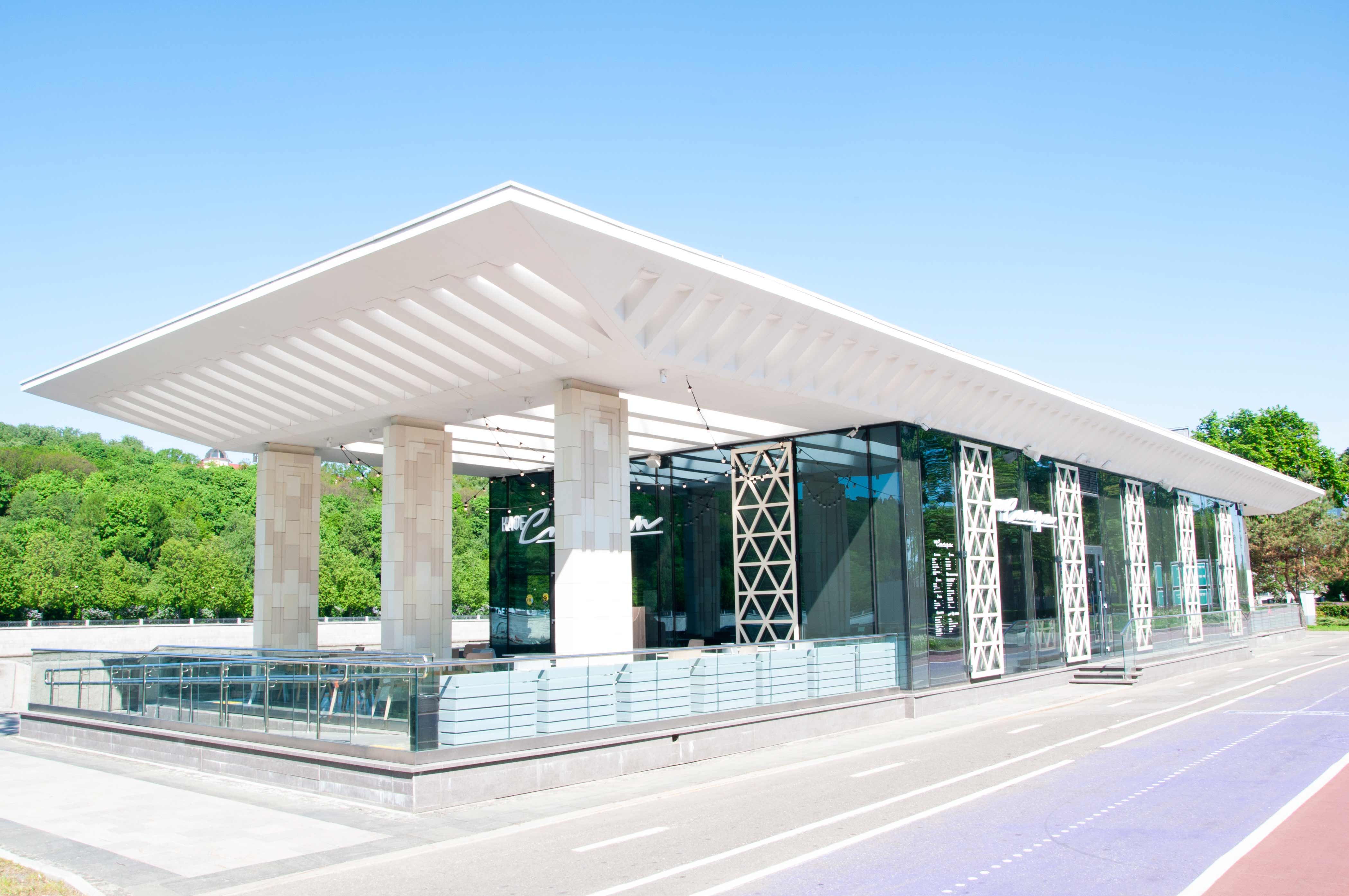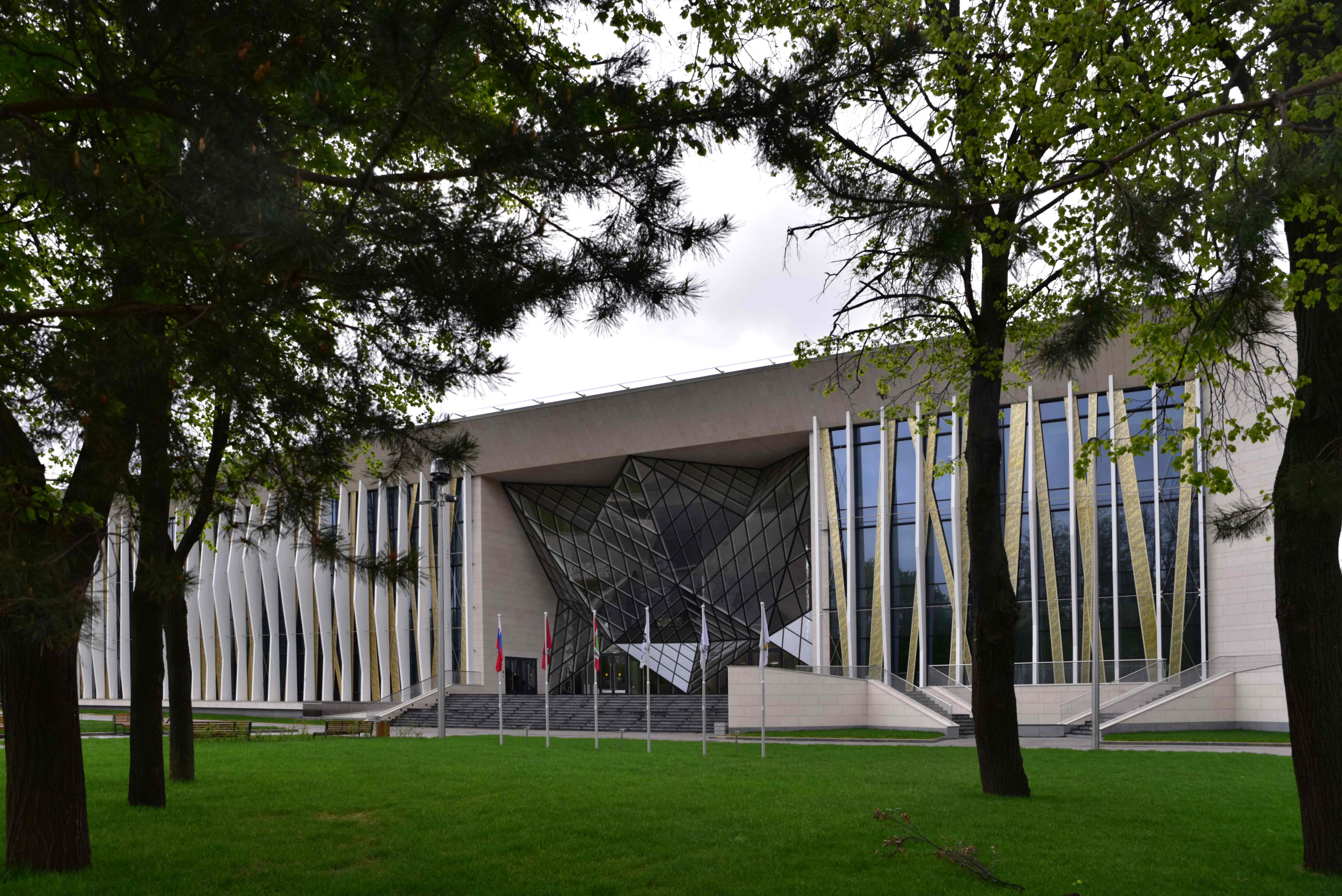 Направление движения входных пандусов повторяют светопропускающие навесы над ними, в свою очередь, переходящие в навес кровли здания.