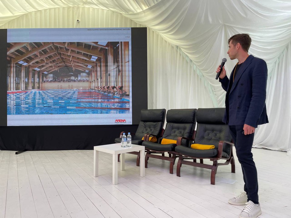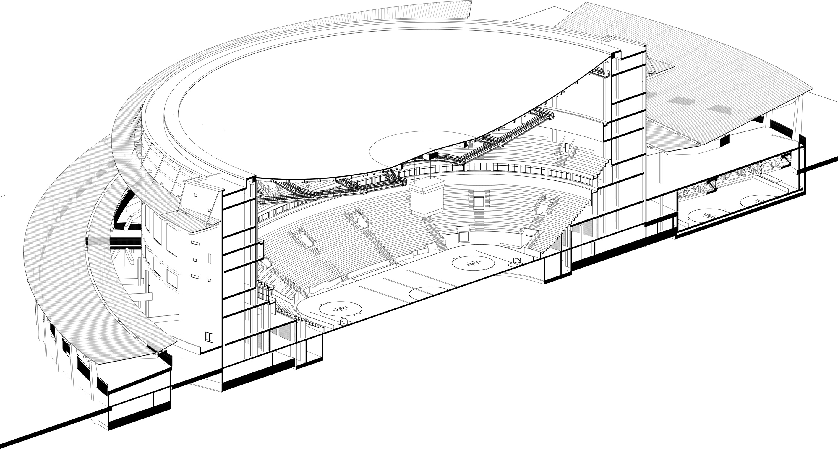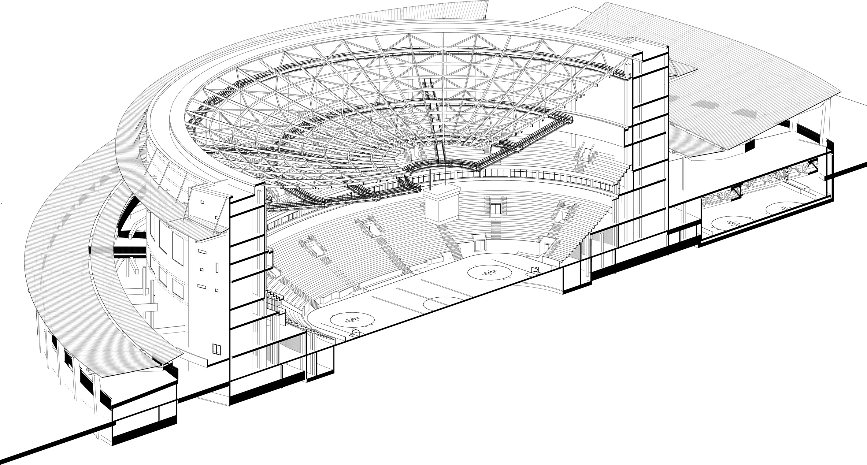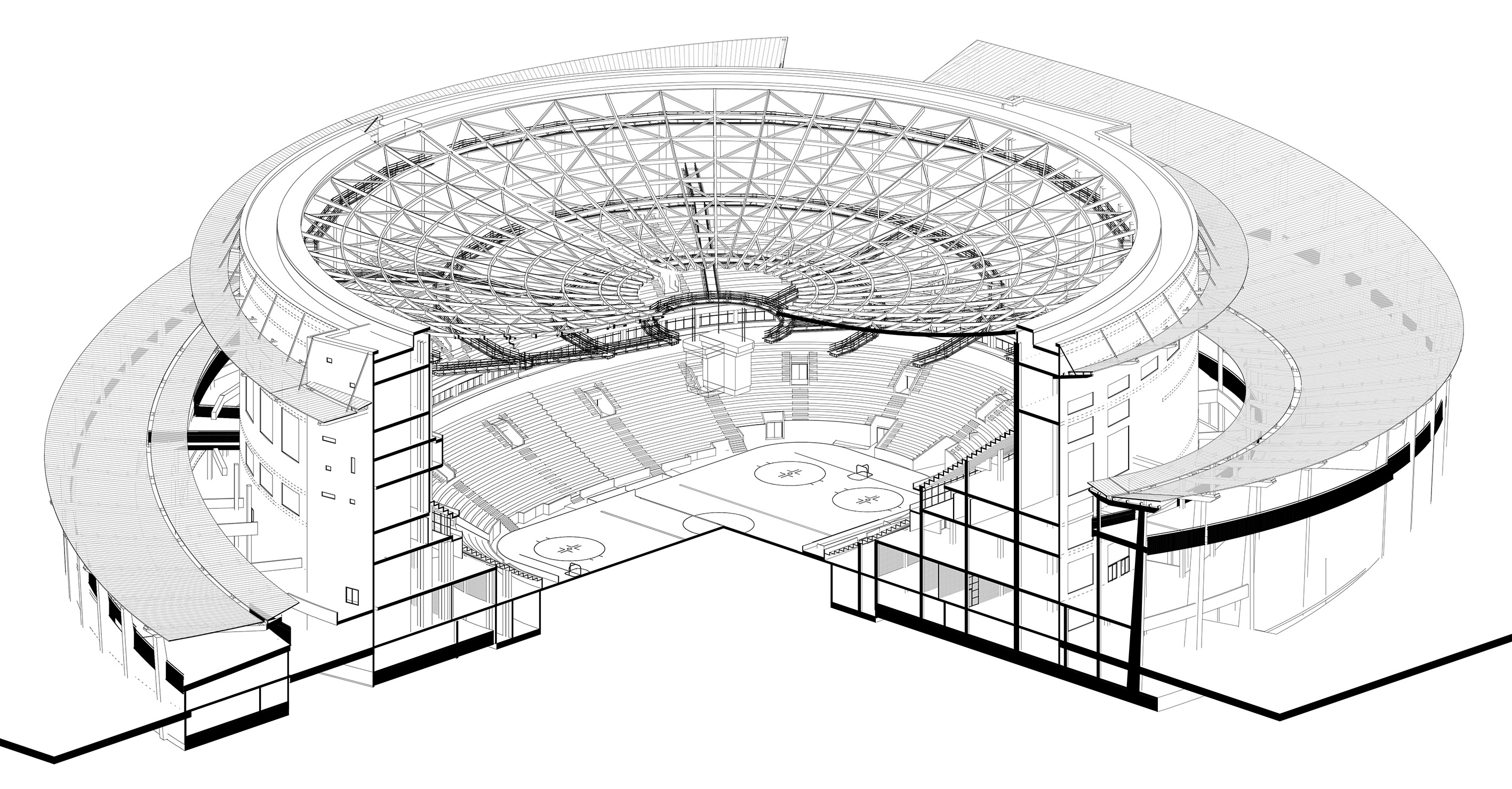 Объемно-пространственное решение здания Ледового дворца обусловлено общим градостроительным решением территории — два прохода к нему подхватываются широкими пандусами, спирально опоясывающими цилиндр основного объёма здания дворца и поднимающими зрителей на верхние уровни, где, начиная со второго этажа, запроектированы вестибюли и фойе. Трибуны для зрителей запроектированы в двух ярусах. Между ярусами размещается уровень лож VIP.