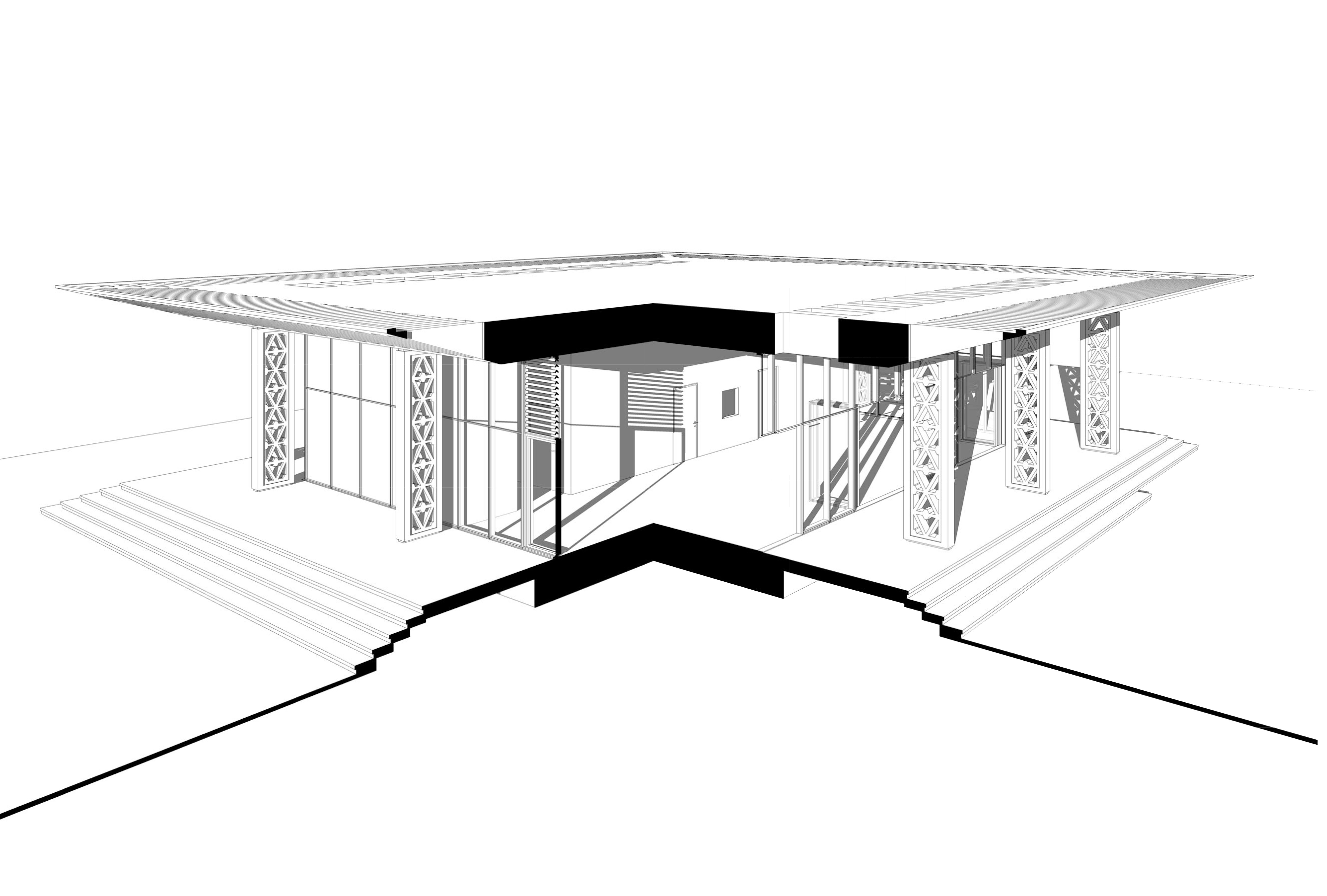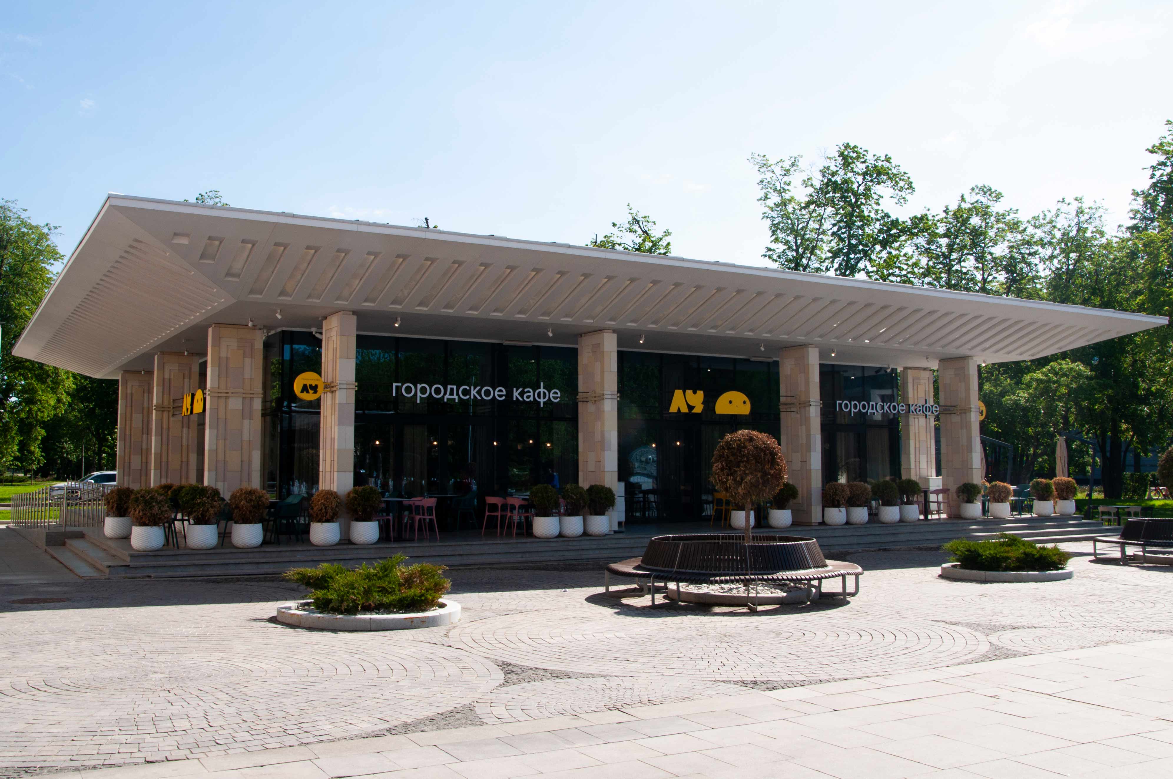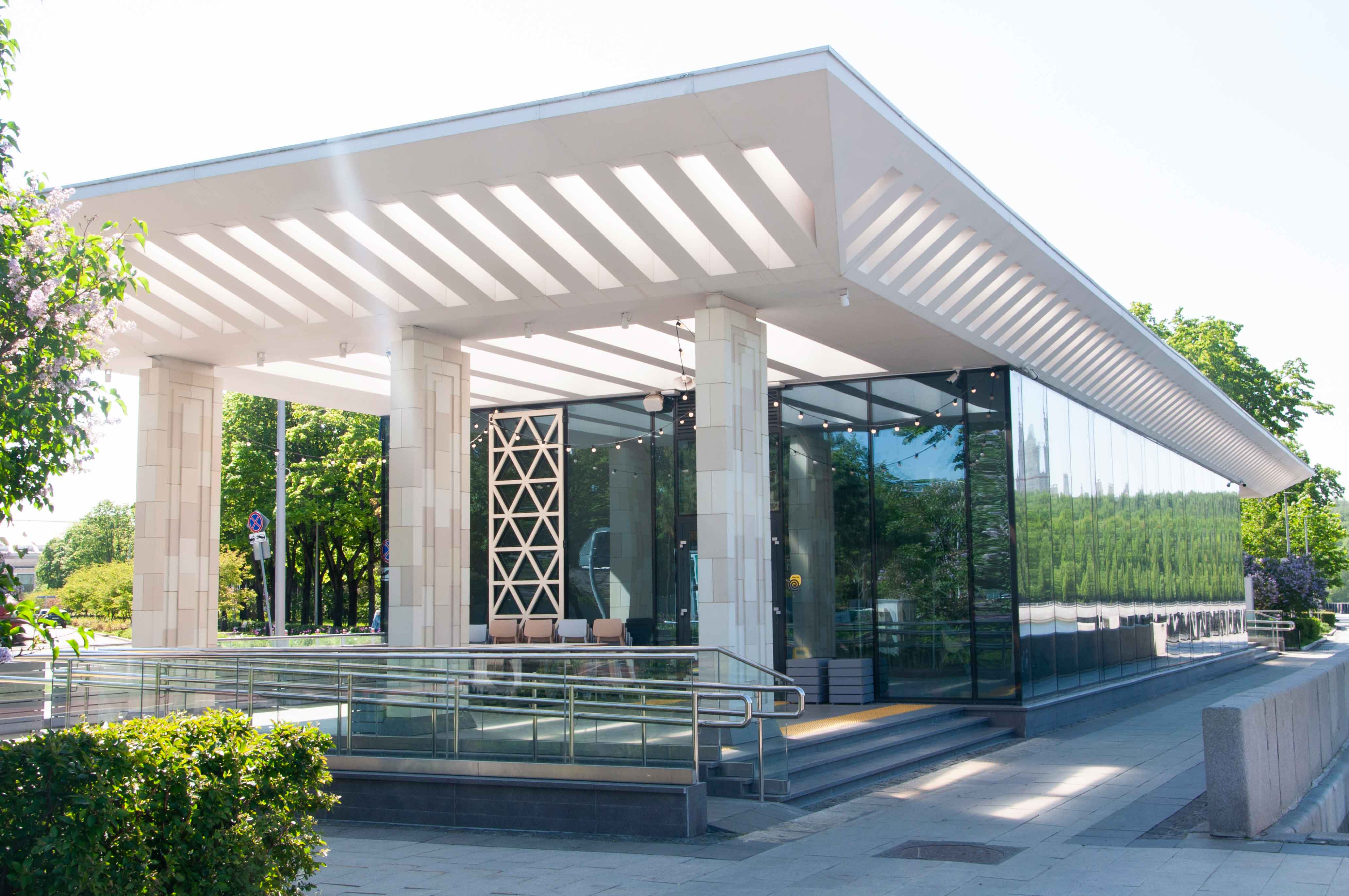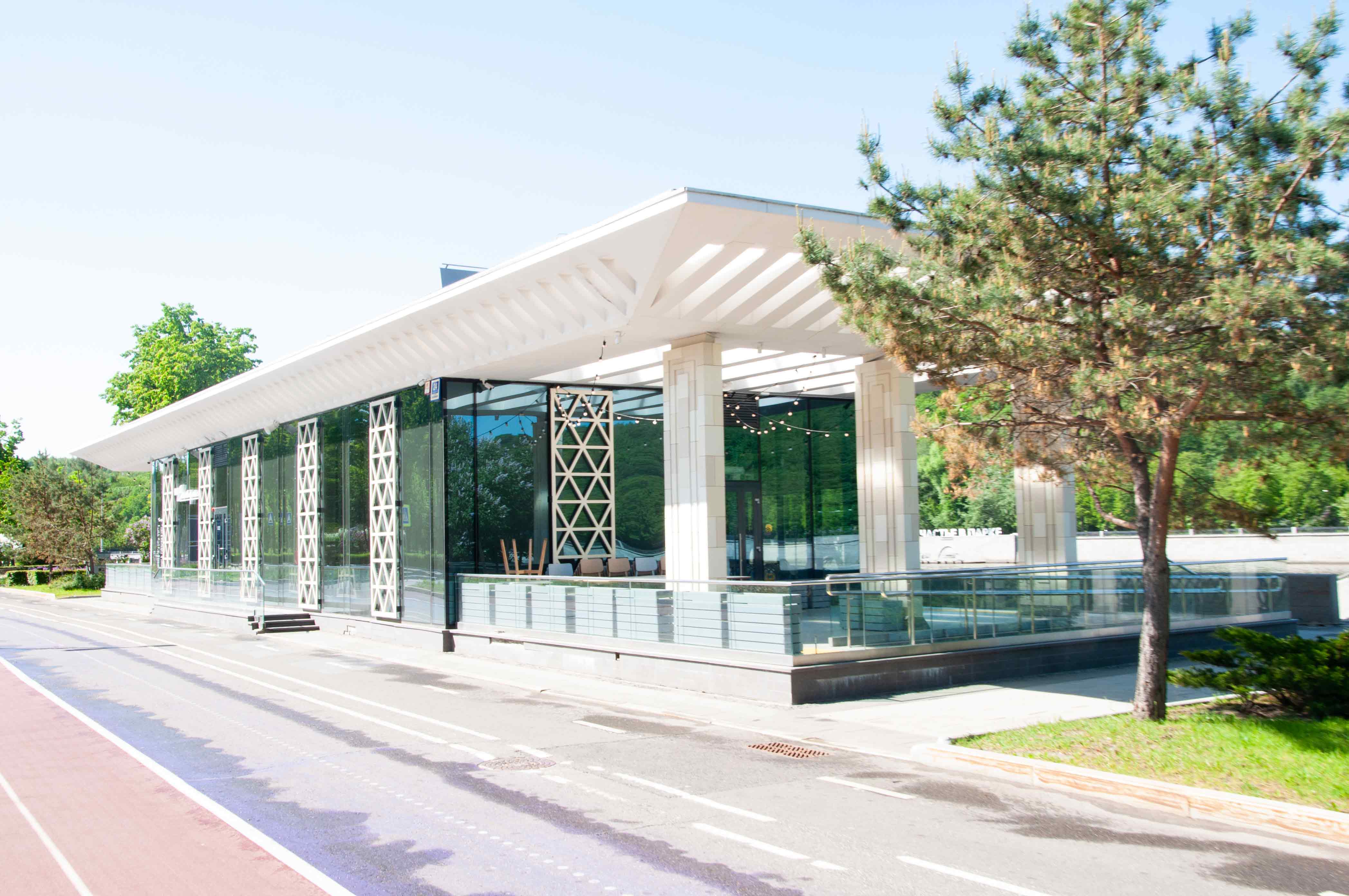 Объёмно-пространственная композиция павильонов строится на сочетании стеклянного объёма и открытых террас, объединённых единой кровлей.