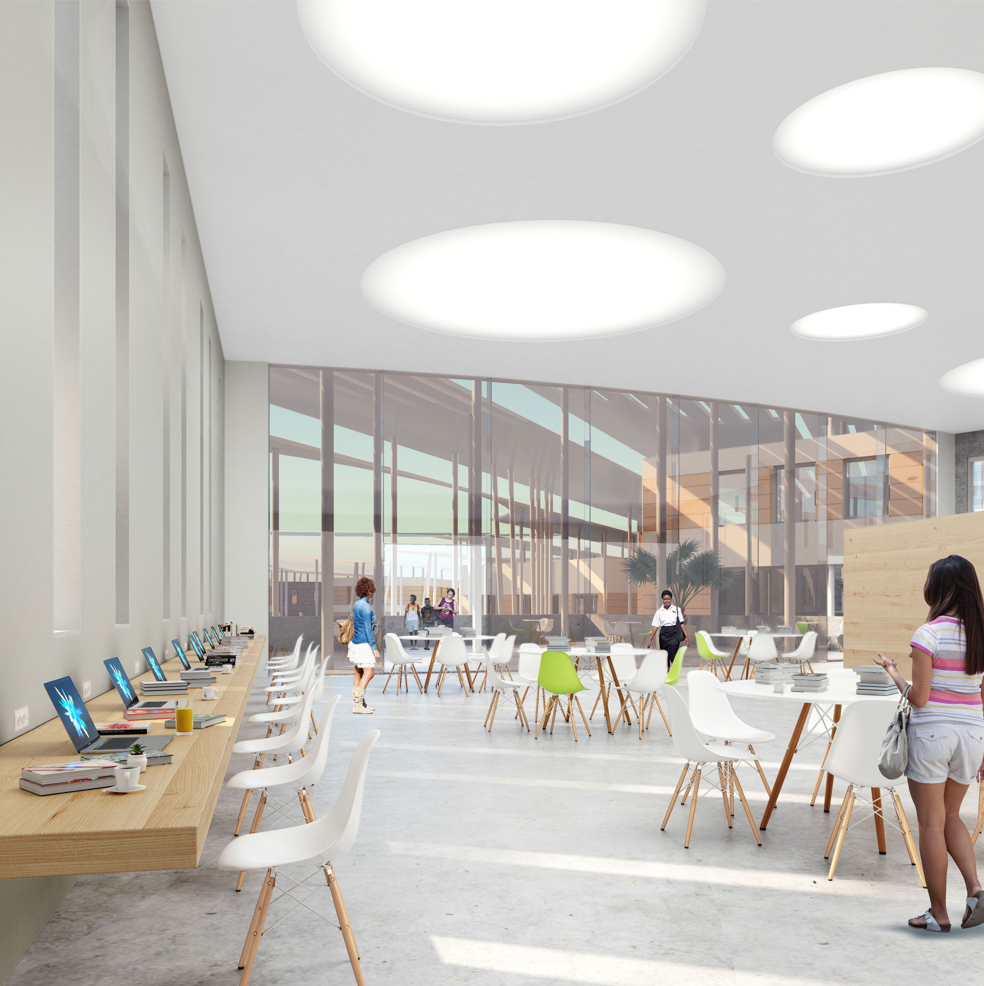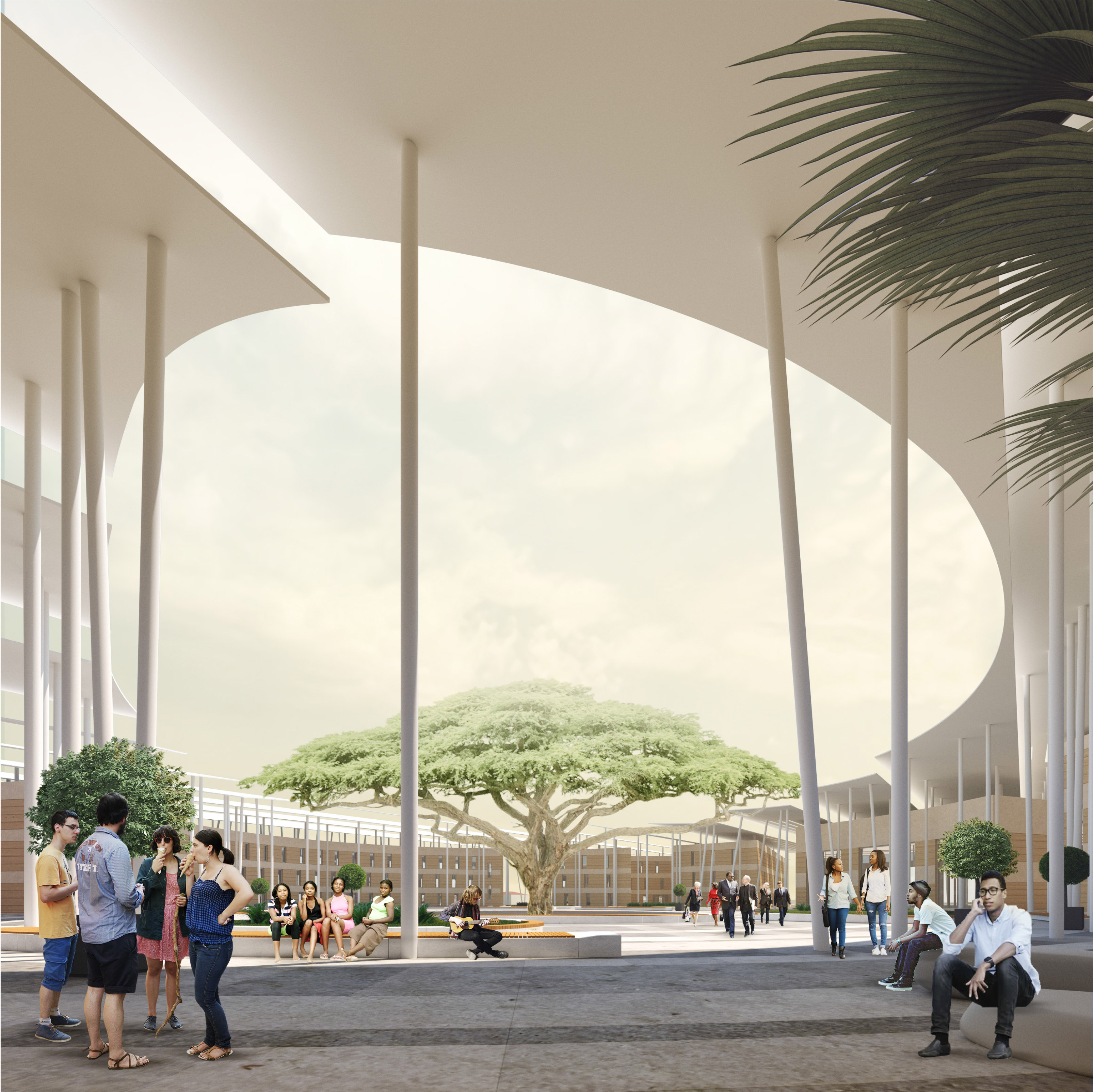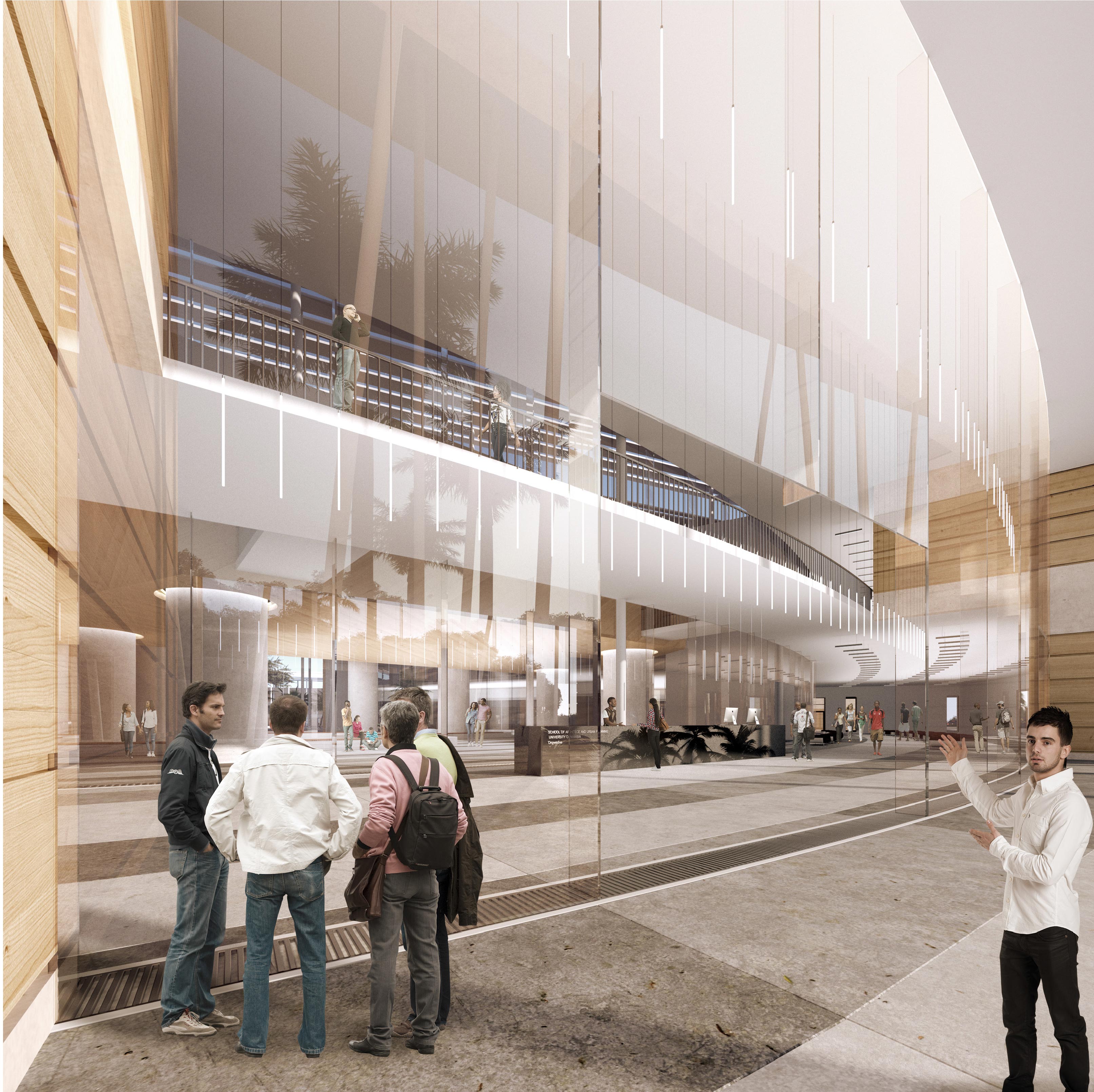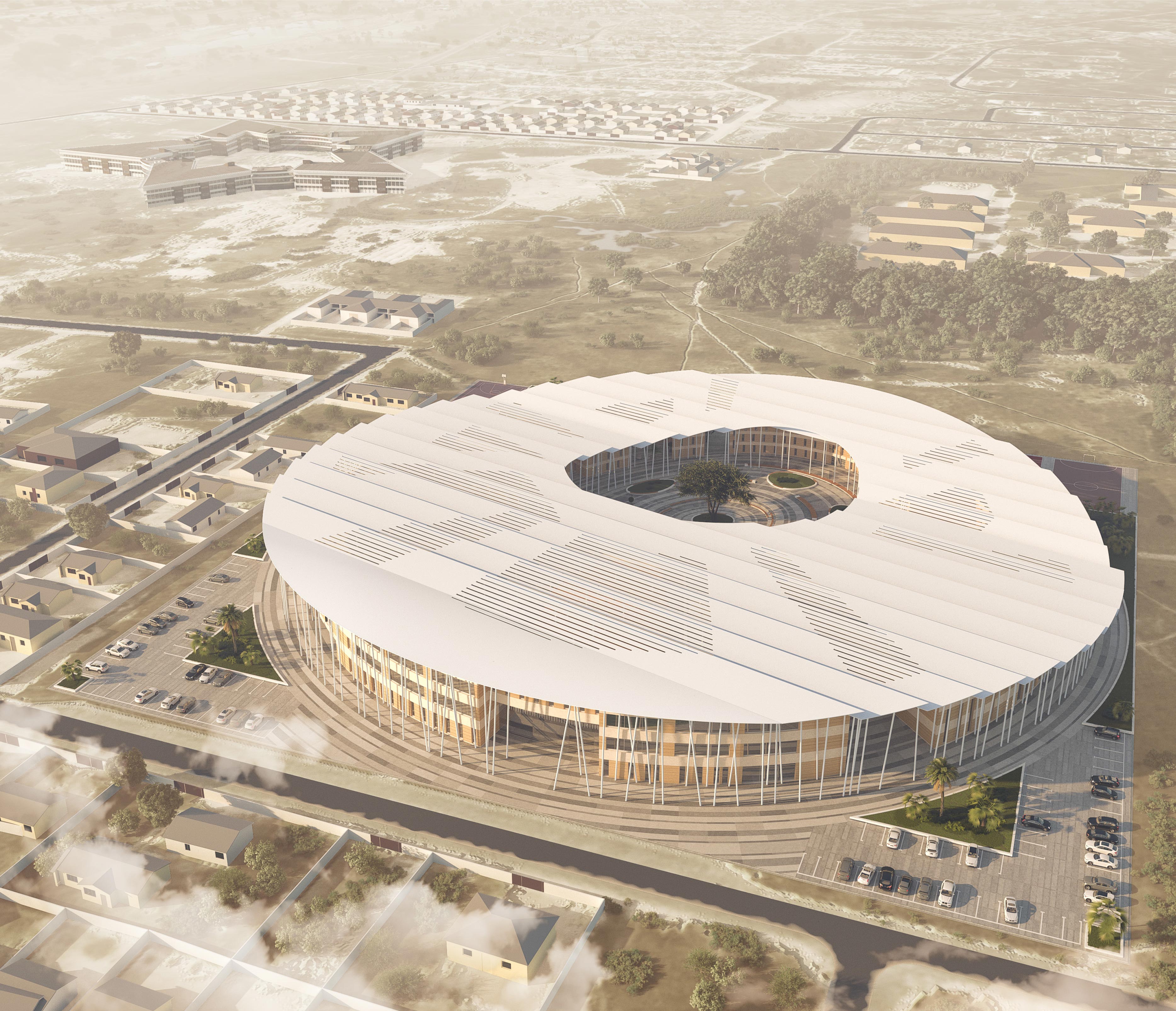 Кампус Факультета архитектуры и градостроительства Университета Намибии для проживания, обучения, общения и досуга решен в виде правильного круга, образованного группой зданий различной, в зависимости от функции, конфигурации, с округлой, неправильной формы, площадью-двором внутри.