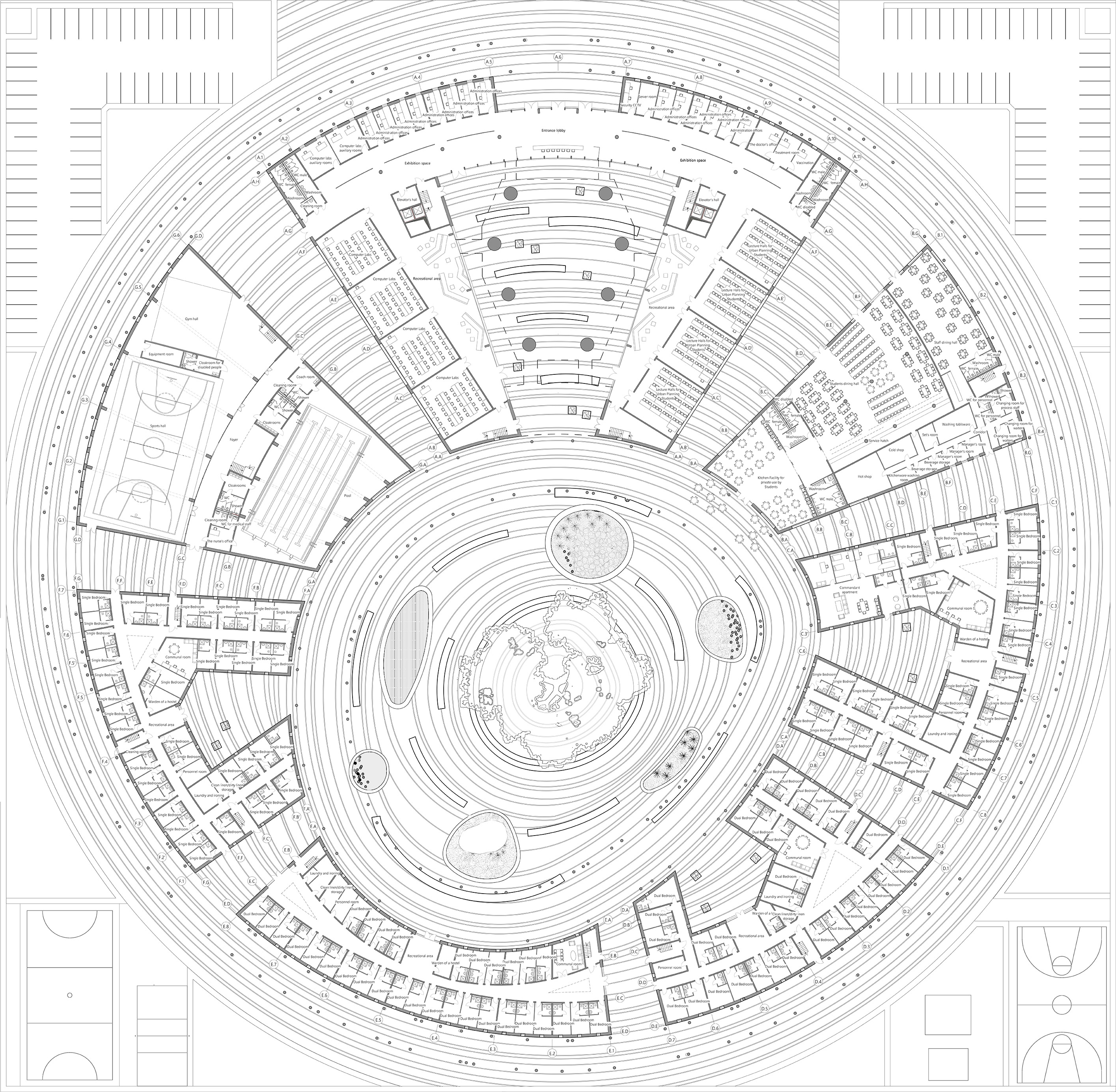 Общая форма круга подчеркивает целостность проектируемого образования, придавая ему черты замкнутого космоса или замкнутого цехового целого, характерного для профессионального сообщества или университета.