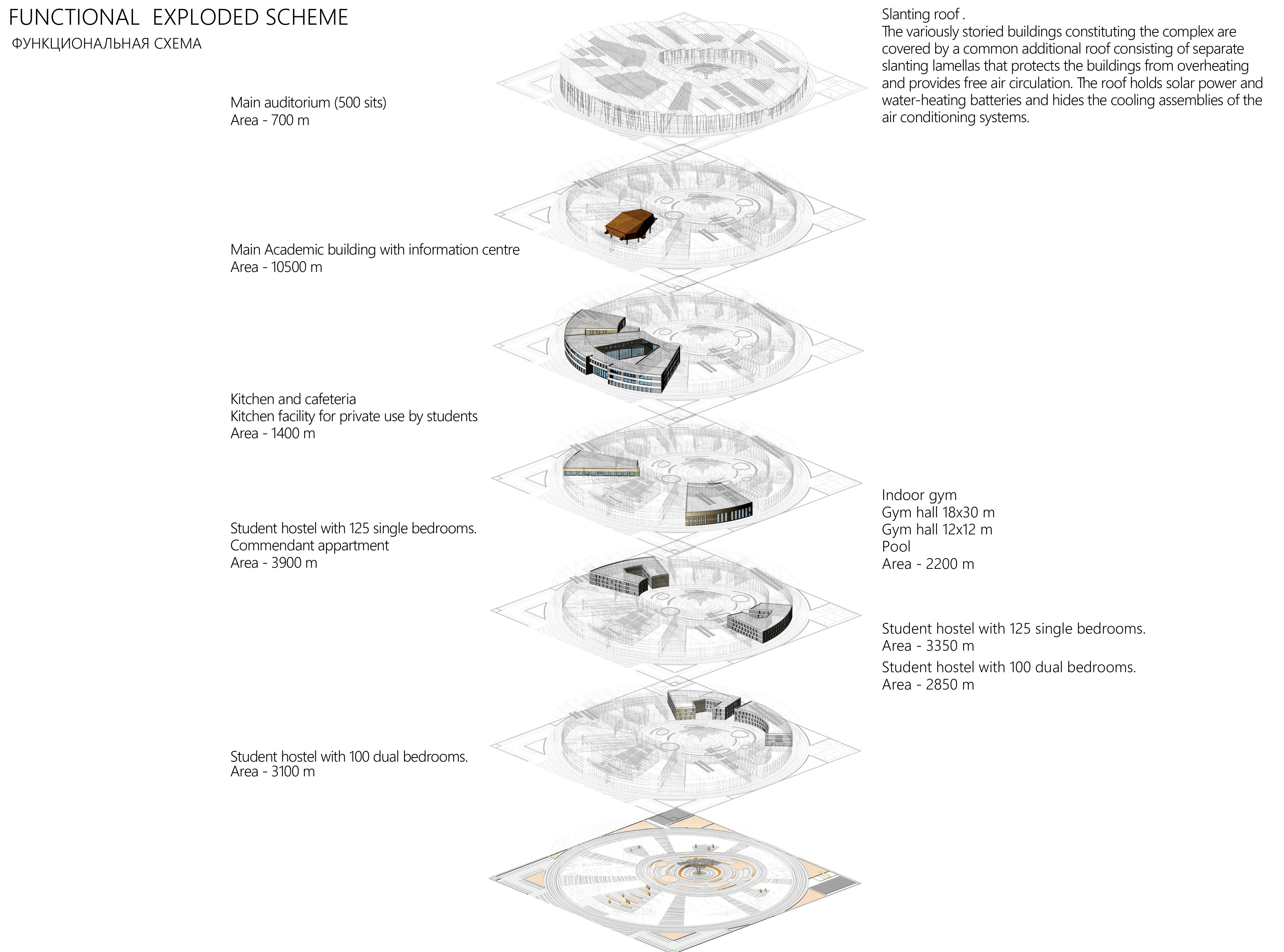 Со стороны главного подъезда к комплексу размещен главный учебный корпус. Далее он фланкируется корпусами, в которых расположены общественные функции: спортивные залы, столовые, библиотека. В глубине участка размещены жилые корпуса. Все они имеют выходы во внутренний двор.